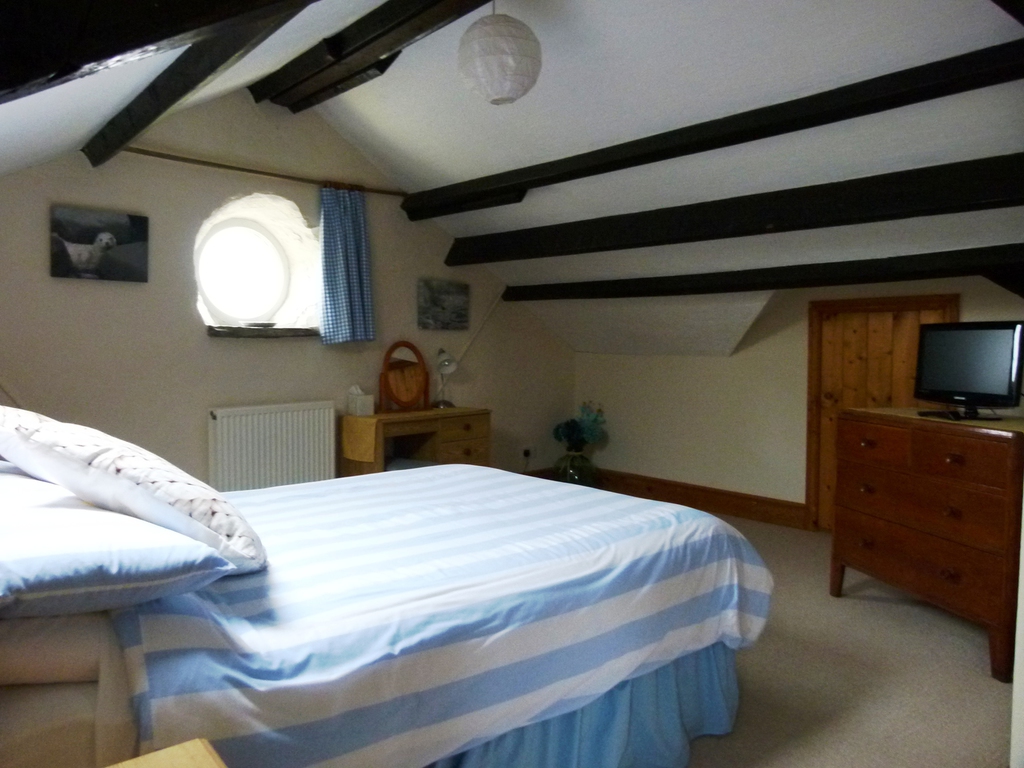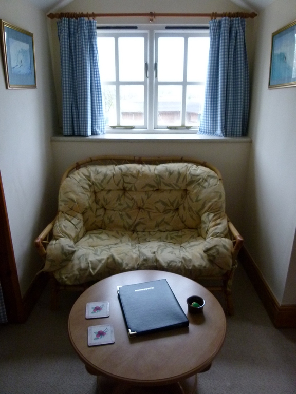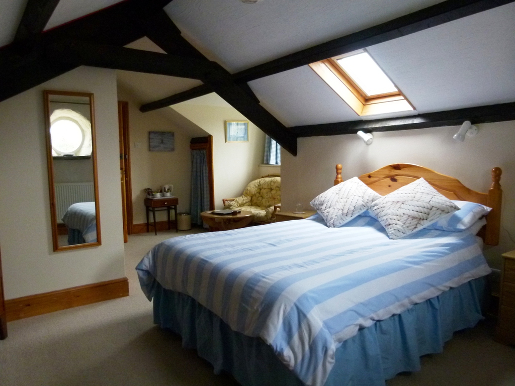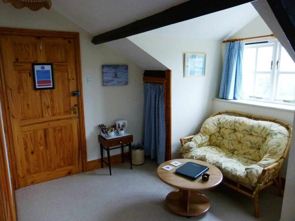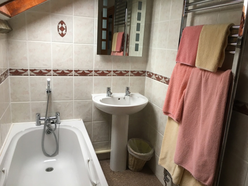 The smaller of our two loft-conversion rooms. This room is en-suite with a bath. It has a small sofa and the usual other facilities our other rooms offer. TV, beverage tray etc.